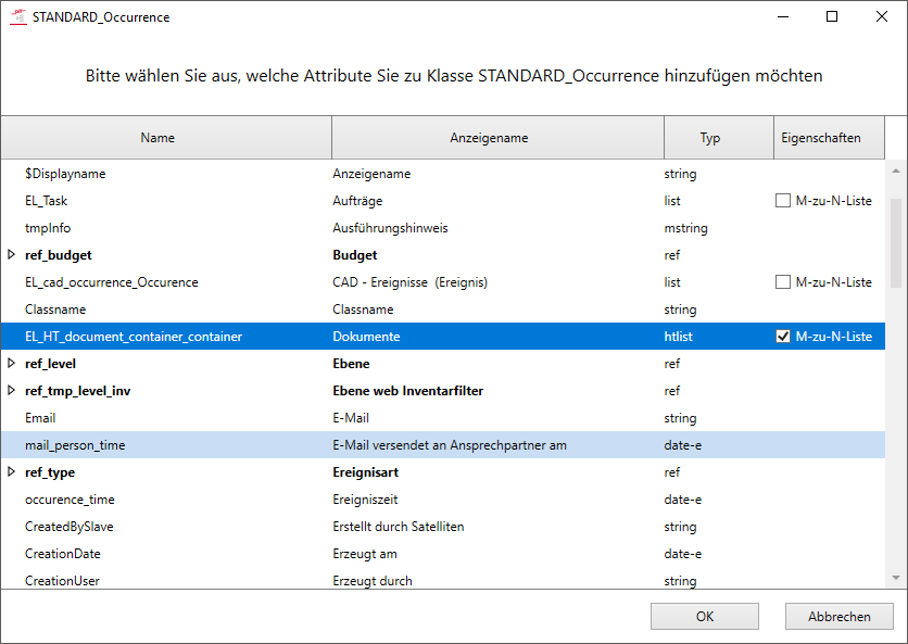 Listenattribute haben von allen Attributen die meisten Eigenschaften. Hier muss zusätzlich die Eigenschaft Rückreferenz ausgewählt werden. Normalerweise passiert das automatisch durch das Abfragen der Attribute über den Webservice. Die Rückreferenz ist ein Referenzattribut an der Referenzklasse und wird zum Aufbau der Liste benötigt. Beispielsweise werden in einer Dokumentenliste am Auftrag alle Dokumente angezeigt, die zurück auf den Auftrag über die Referenz ref_Task zeigen.